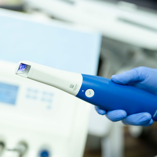 Ein Intraoralscanner ist ein handliches Gerät, das über die Zahnreihen geführt wird. Dabei nimmt es zahlreiche Einzelaufnahmen auf, die eine spezielle Software am Computer zu einem dreidimensionalen Bild Ihrer Zähne zusammensetzt. Das Verfahren ist berührungsarm, schnell und völlig ohne Abdruckmasse – ideal für Menschen mit sensibler Reaktion im Mundraum.